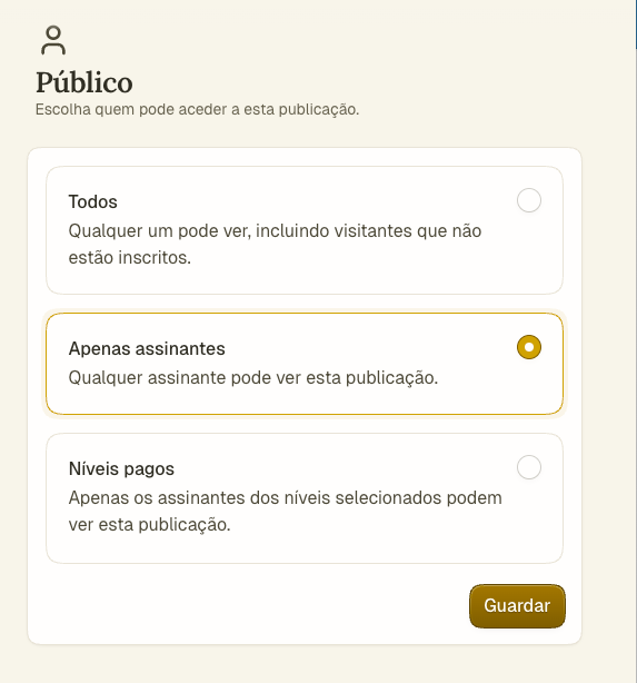 Agora você pode escolher mostrar os artigos publicados apenas para os assinantes. E em breve, níveis pagos para que os leitores possam apoiar você!